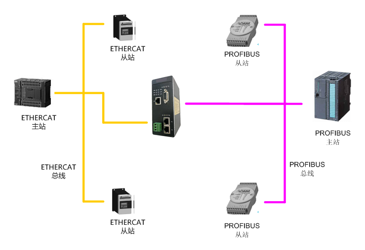 ● 网关做为 ETHERCAT 网络的从站,可以连接倍福、欧姆龙、基恩士等厂家的PLC。