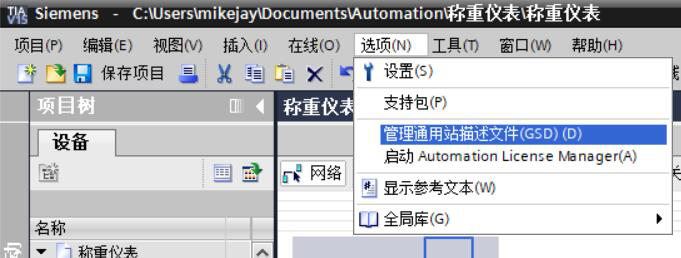 打开博图,建立新项目“称重仪表”。进入设备和网络,在选项中选择管理通用站描述文件,安装GSD文件。