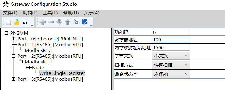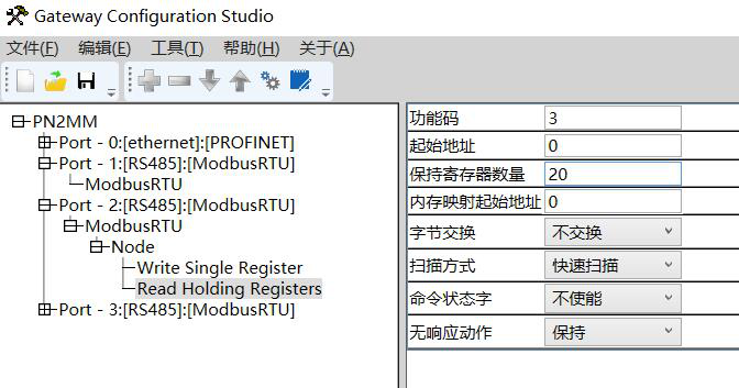 组态设置完成后下载到PLC中,并开始配置Modbus参数设置。首先安装Modbus RTU转Profinet网关配置软件,打开软件新建项目选择PN2MM。