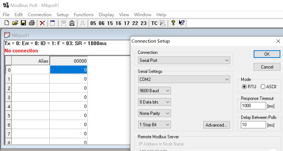 10.打开Modbus Poll软件,连接Modbus从站,设置485通讯的波特率,数据位,奇偶校验。