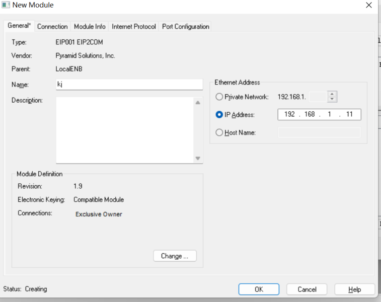 5、设置EthernetIP转Modbus TCP网关名称及IP地址(名称可随意,主要是IP地址对应),点击Change设置输入输出长度。