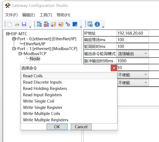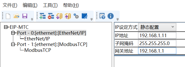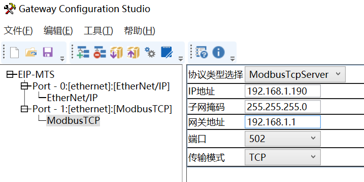 12、EthernetIP转Modbus TCP网关做ModbusTCP服务器,在网关配置软件处选择EIP-MTS。