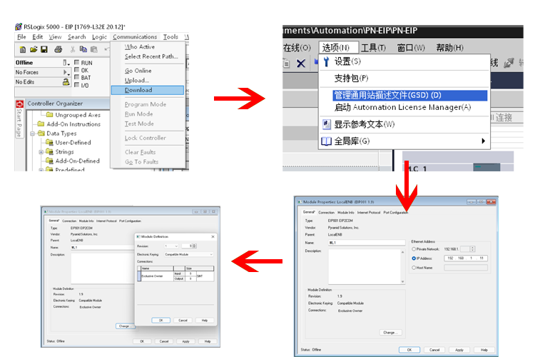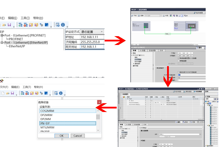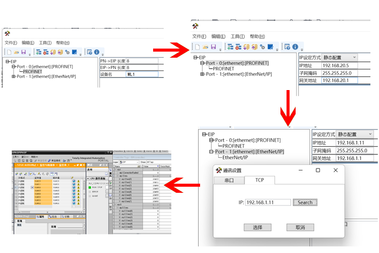 在工业自动化领域,PLC扮演着至关重要的角色。随着技术的不断进步,PLC通讯协议的兼容性变得越来越重要。本文将详细介绍如何通过无锡耐特森Profinet和Ethernet/IP网关,将罗克韦尔PLC的EtherNet/IP接口与西门子S7-1200 PLC的Profinet接口进行连接和配置,从而实现两种通讯协议的互操作性。首先,我们需要准备罗克韦尔PLC以及西门子的PLC、相适应的DC24V电源模块、一台用于配置的电脑、ProfinetEthernet/IP的网关设备以及网络通讯线缆。启动罗克韦尔PLC配置软件,进入硬件配置界面。在此界面中,我们可以导入所需的Profinet和Ethernet/IP网关设备描述文件,这是实现Profinet与Ethernet/IP通讯的关键,完成安装程序后,进行模块化扩展操作。具体步骤包括:选择“新建模块”以添加新模块,然后搜索并选中Profinet转Ethernet/IP的网关模块。进入Profinet和Ethernet/IP网关模块的参数设置界面,通过双击模块名称实现。在此界面中需要配置Profinet和Ethernet/IP网关模块的设备名称及IP地址。点击“更改”以设定数据输入输出的长度。本实例中设置为8字节,这是确保数据通讯稳定的关键参数。最后将配置信息下载到PLC。西门子PLC配置步骤:确保GSD文件已成功安装在系统中。GSD文件是PROFINET设备的描述文件,它包含了设备的配置信息和参数,是实现PLC与PROFINET网络通讯的基础。导入EtherNet/IP转换至PROFINET网关的配置文件进行组态。这一步操作将使得西门子PLC能够识别并正确处理来自网关的数据。设定Profinet和Ethernet/IP网关的IP地址与设备名称。将确保PLC能够准确地将数据发送到正确的目标地址。在执行数据通讯配置的过程中,首先需要设定数据传输的输入与输出长度。这是确保数据完整性和准确性的关键参数。完成设置后,将配置信息下载到PLC中。打开Profinet转Ethernet/IP网关的配置软件,创建一个新项目,并选择PN-EIP作为项目类型。这一步操作将使得网关能够同时处理Profinet和Ethernet/IP两种协议的数据。进一步配置与西门子PLC之间的通讯参数,确保EtherNet/IP转PROFINET网关能在PROFINET网络中正确识别其IP地址和设备名称。数据交换的长度需设置为8字节,以保证数据的完整性和准确性。设定EtherNet/IP转PROFINET网关在罗克韦尔PLC中的IP地址应与系统组态中设定的值保持一致确保PLC能够正确地将数据发送到网关,进而实现与PROFINET网络的通讯。在配置全部完成后,选择EtherNet/IP转PROFINET网关的默认IP端口进行配置信息的下载操作。特别注意,在进行下载时,务必通过Profinet和Ethernet/IP网关设备的底部网口进行操作,以避免可能的配置错误。建议在未插入正面网口的情况下执行下载。完成下载操作并确保EtherNet/IP转PROFINET网关模块成功接收安装文件之后,应重新激活该Profinet和Ethernet/IP网关模块的电源。这一步操作将使得Profinet和Ethernet/IP网关能够正式投入运行,实现EtherNet/IP与PROFINET之间的通讯。通过以上步骤,我们可以成功地将罗克韦尔PLC的EtherNet/IP接口与西门子PLC的PROFINET接口进行连接和配置。这一技术的实现不仅提高了PLC通讯的灵活性和兼容性,还为工业自动化领域的发展带来了更多的可能性。在实际应用中,我们可以根据具体的需求和场景选择合适的PLC和通讯协议组合以满足不同的控制需求。同时随着技术的不断进步和应用场景的不断拓展我们相信未来PLC通讯技术将会更加成熟和多样化为工业自动化领域的发展注入更多的可能。