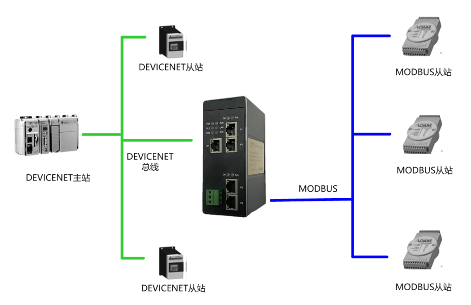 MODBUS-RTU 网络连接起来。本网关连接到DEVICENET总线中做为从站使用,连接到 MODBUS-RTU 总线中做为主站或从站使用。