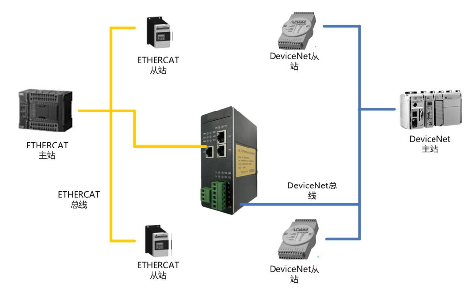 ● 网关做为 ETHERCAT 网络的从站,可以连接倍福、欧姆龙、基恩士等厂家的PLC。