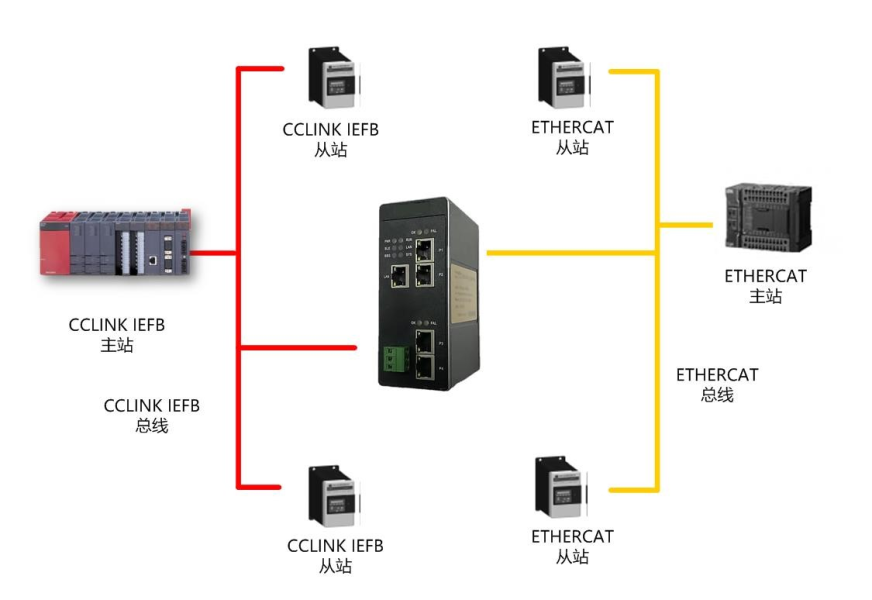● 网关做为 ETHERCAT 网络的从站,可以连接倍福、欧姆龙、基恩士等厂家的PLC。